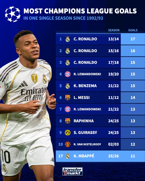 而在欧冠单赛季进球排行榜上,姆巴佩距离C罗在2013/14赛季的17球纪录还有6球之差。